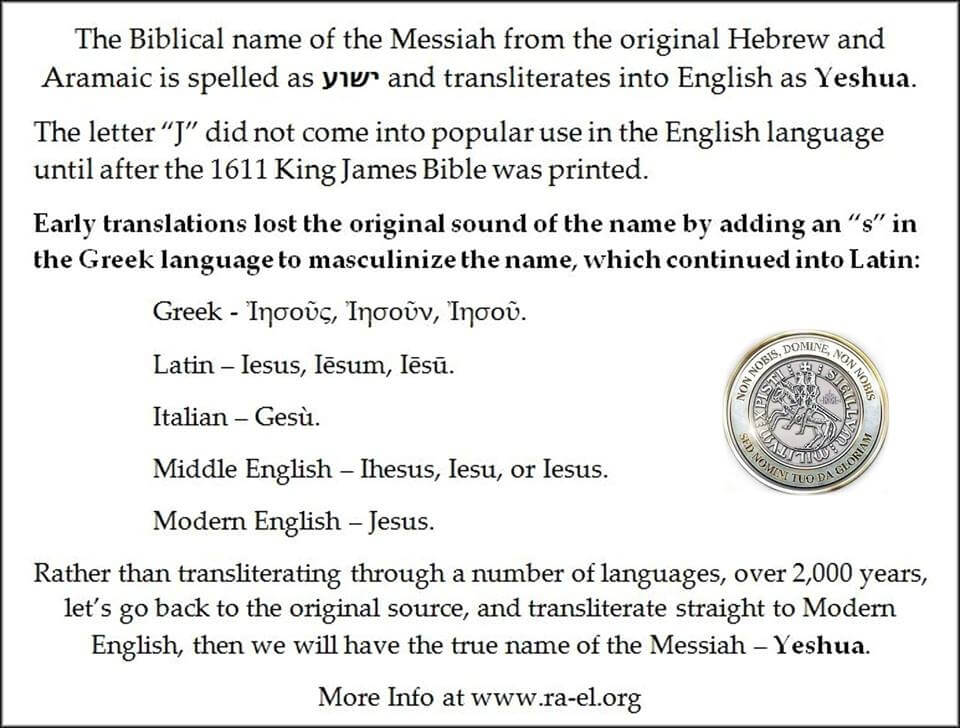 As any scriptural scholar will tell you, Christ’s name was “Yeshua”, not “Jesus”. Some will tell you that the name change was caused by “grammatical errors”, “translation differences”, or a litany of other excuses. If you go anywhere in the world and ask for a Coca-Cola, you’ll get a Coca-Cola, yet for some mysterious reason, the world forgot the proper name for the Son of God, a name that would give power to all those who would properly invoke it.