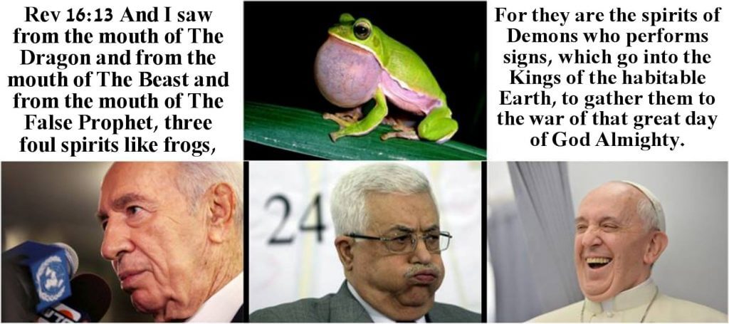 13“And I saw from the mouth of The Dragon and from the mouth of The Beast and from the mouth of The False Prophet, three foul spirits like frogs,”